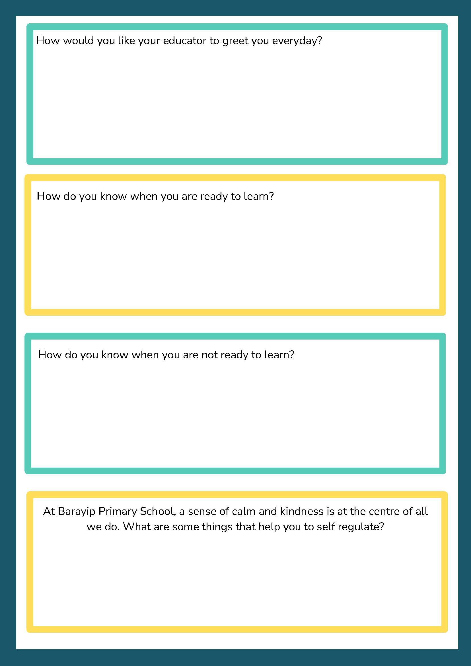 Consistent Predictable Routines, adapted from the Berry Street Education Model are researched and evidence-based in having success in learning spaces. These consistent, predictable routines are implemented by all educators, for all students, in all learning areas at Barayip Primary School.